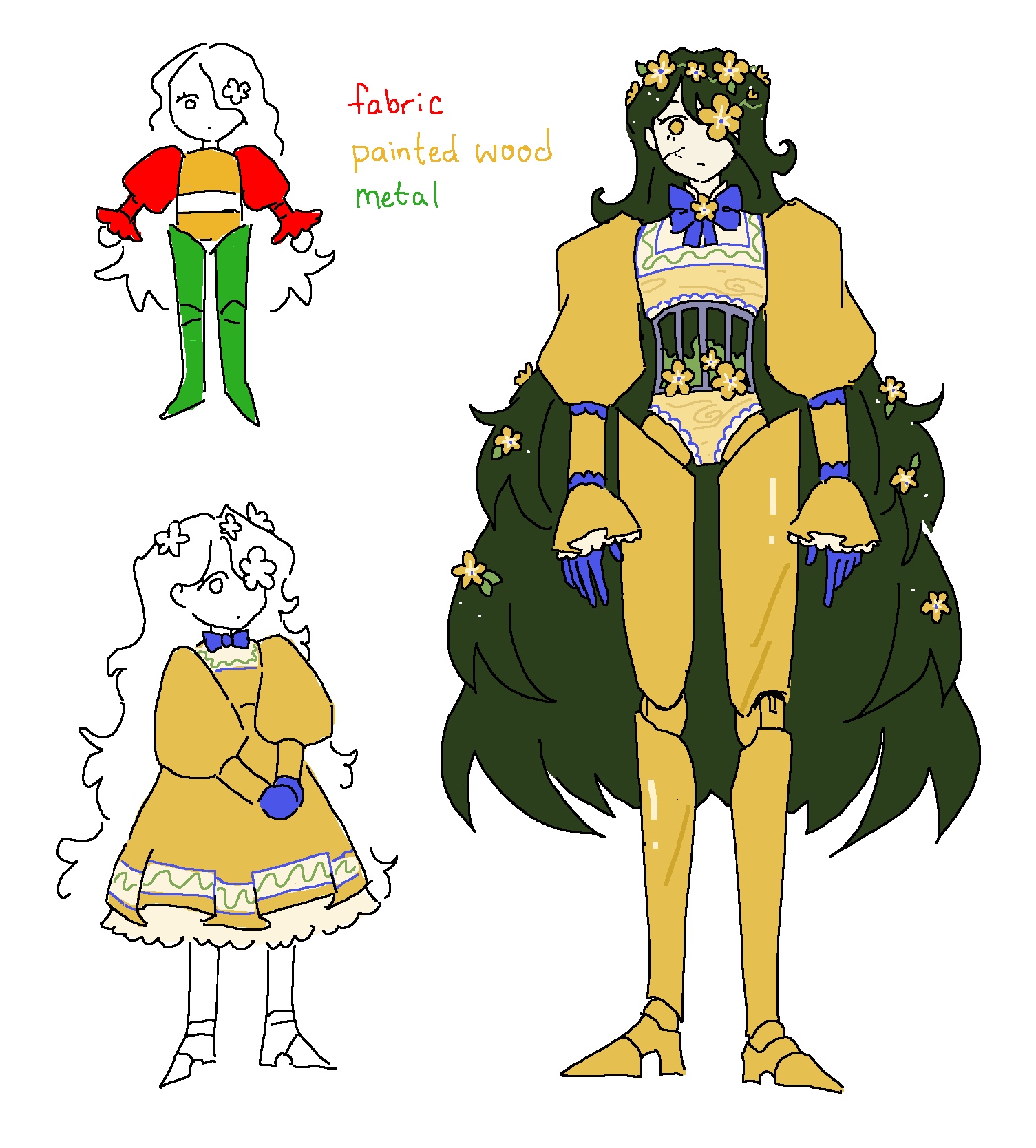 Fortune is a tall automaton with long black hair, yellow eyes, and pale skin. There is a crack on the left side of her face, while the right side of her face is obscured by hair and yellow flowers, which seem to grow out of her body. Her midsection is made out of wood, with a metal cage-like structure in the stomach area. The same flowers grow out of her midsection and adorn her hair. She is typically seen wearing a short yellow jacket with large, puffy sleeves. Her legs are plated with a yellowish metal and have visible ball joints.